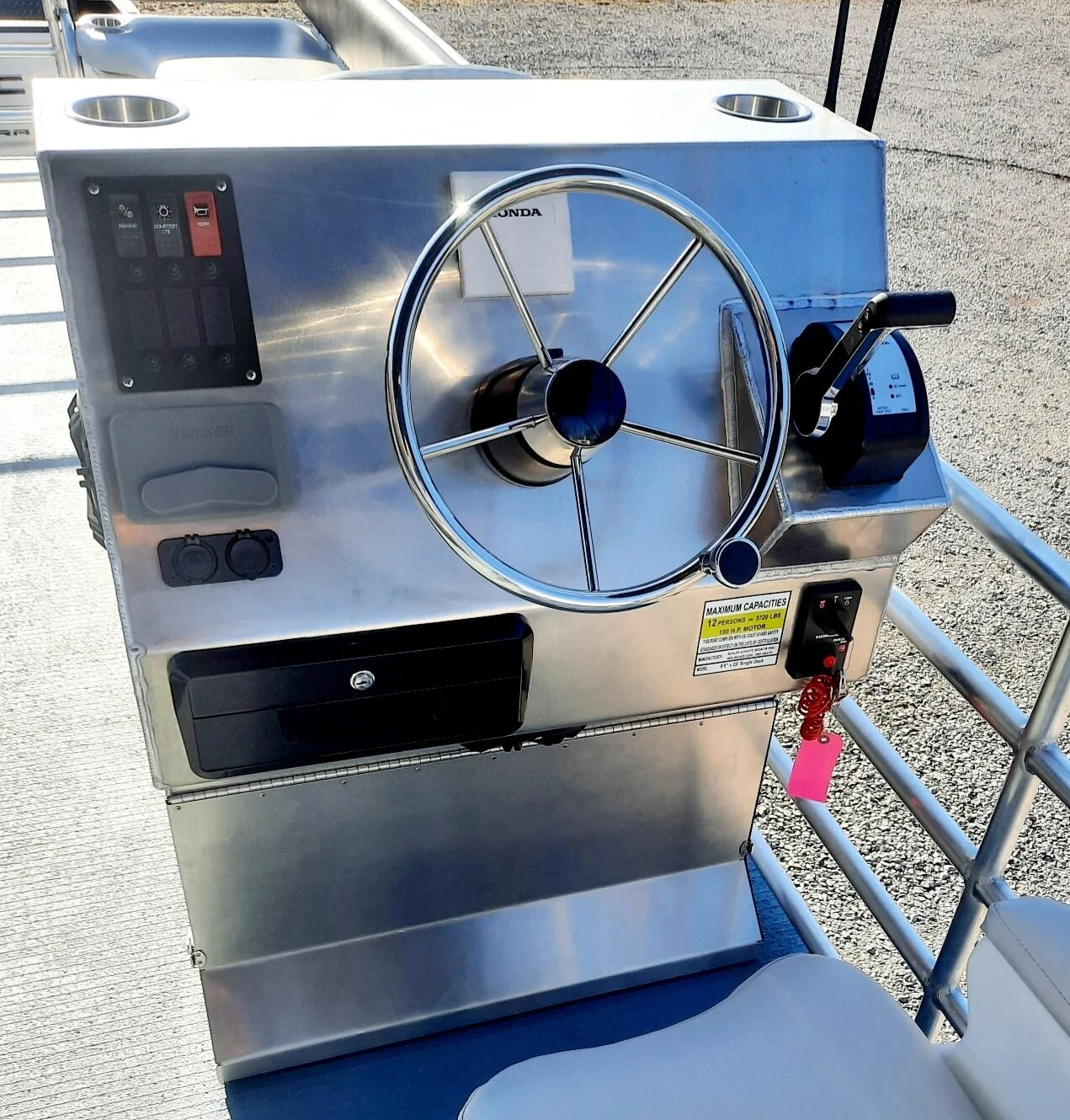 A color matched, swiveling, pedestal seat with armrests and slider at the helm is standard.